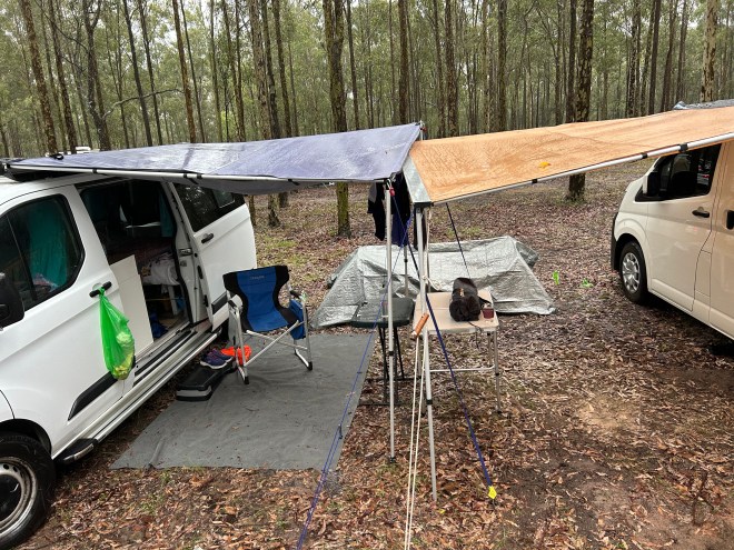 Listening to the rain as I lie in the dark, I ask myself if this is fun. I’m dry. I’m warm. Actually, I’m quite cosy. But the noise of water on metal is loud and the boxy motorhome is shuddering. A clunk reminds me that I’m camped in a forest of gum trees, tall and spindly things, young and limber. Not widow-makers, fortunately. I wonder how my gutsy friend is coping in the swag. Is she still dry? Is she safe? Should I get up and go out, bring her inside to sleep on my floor? Would she already have crept inside one of the other girls’ vans since we’re all parked together in a commune-like square? We’re in this together, I remember one declaring before we left the last camp, a spontaneous and abrupt decision as another read the weather report. Shithouse weather approaching, the BOM said. We should go, Wonder Woman said. Waiting til tomorrow would mean setting up in the storm and possibly getting bogged. They all agreed. But, but… I said, panicking because that wasn’t the plan and my mind isn’t pliable. I’d been thinking a cup of tea would be nice, and then perhaps a stroll on Jimmy’s beach… Later, I was told with much hilarity that I looked like a stunned mullet.