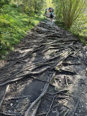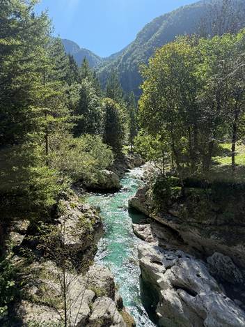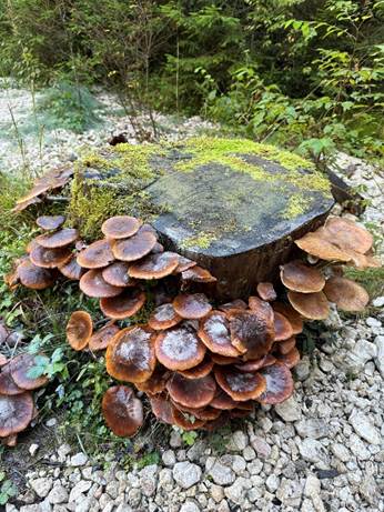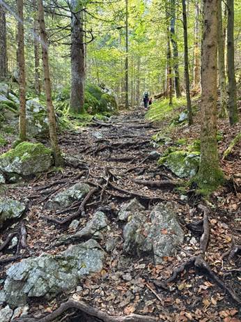 A constant challenge was the ground itself. Slovenia is predominantly limestone, a rock that can be smooth and slippery, or like shattered marbles shifting underfoot. Stones big enough to tread on can be jagged with edges like blades, and unstable. Where the soil is shallow over the limestone base, roots of trees criss-cross the track like scenes from a horror movie. Each step needed to be taken carefully and time and time again, I was grateful for my poles which saved me from tripping or twisting an ankle. Looking at the ground so much did mean having to stop to look up now and then, but even along the track there are things to admire: lichens and mosses, fungi and teeny flowers, worms and the occasional small snake. What’s right in front of you can be the best view.